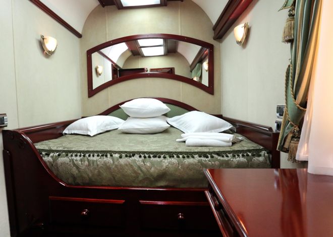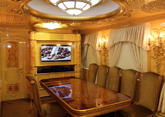 В обычной железнодорожной кассе купить билет на путешествие в таком вагоне не получится. Их заказывают заранее через письменную заявку. В вагоне-салоне есть зал, спальня, кабинет, кухня, душ и туалет. Также есть отдельное купе для расчета и охраны.
