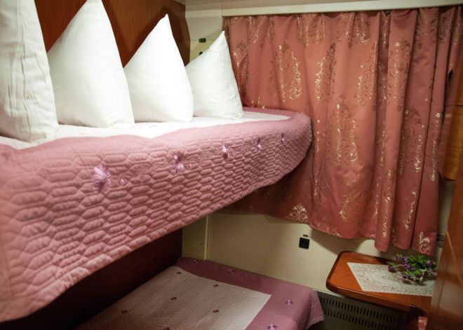 Так выглядит спальня в одном из вагонов "Укрзализныци", которые называются вагонами-салонами. Судя по описанию на сайте "Укрзализныци", вагон-салон - это премиум-услуга, рассчитанная на богатых пассажиров. Путешествие в таком "отеле на колесах" стоит как 11 билетов в спальном вагоне плюс многочисленные сопутствующие расходы. Для сравнения, стоимость 11 спальных билетов из Львова в Харьков - это 13 тыс. грн