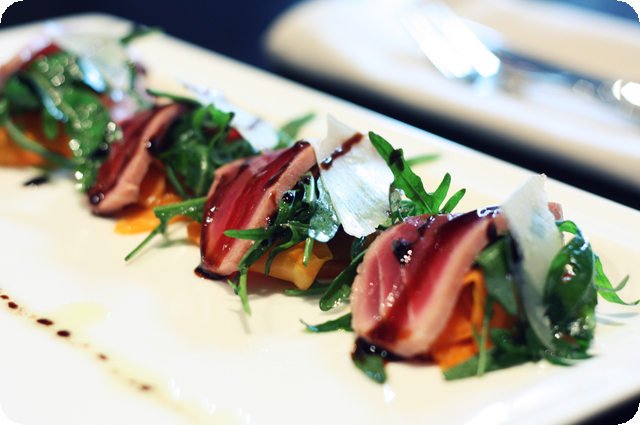 Карпаччо с запеченной свеклой, сыром филадельфия, рукколой и кедровыми орехами – 55 грн.