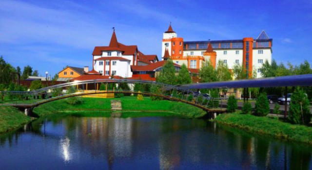 Красивый загородный комплекс, который назвали парком-отелем, «вырос» в окружении соснового леса. Это место для отдыха с комфортом: три плавательных бассейна, большой сад и мини-зоопарк. Два коттеджных городка – «Замо́к» и «Село» примут до 100 посетителей. На территории – три ресторана разной кухни.