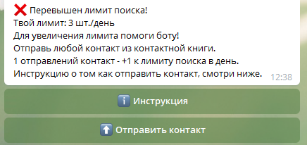 Примечательно, что бот позволяет беспрепятственно получить сведения только по трем номерам в день. Однако лимит снимается очень просто - бот просит пользователя о нехитрой услуге: предоставить ему новый контакт из вашей телефонной книги.