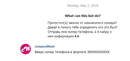 Бот выдает имя и фамилию владельца номера телефона. Чтобы получить такую информацию, достаточно ввести номер в формате 380ххххххххх и нажать ввод. Результат выдается мгновенно.