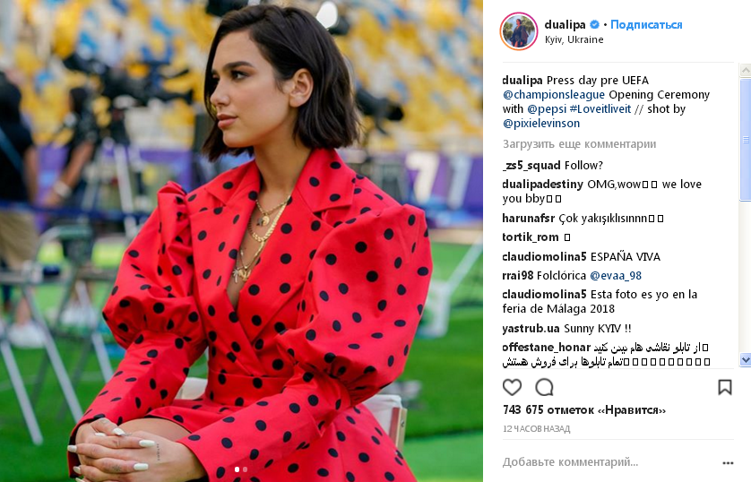 Известная британская певица Дуа Липа прибыла в Украину, где примет участие в открытии финала Лиги чемпионов между "Реалом Мадрид" и "Ливерпулем".