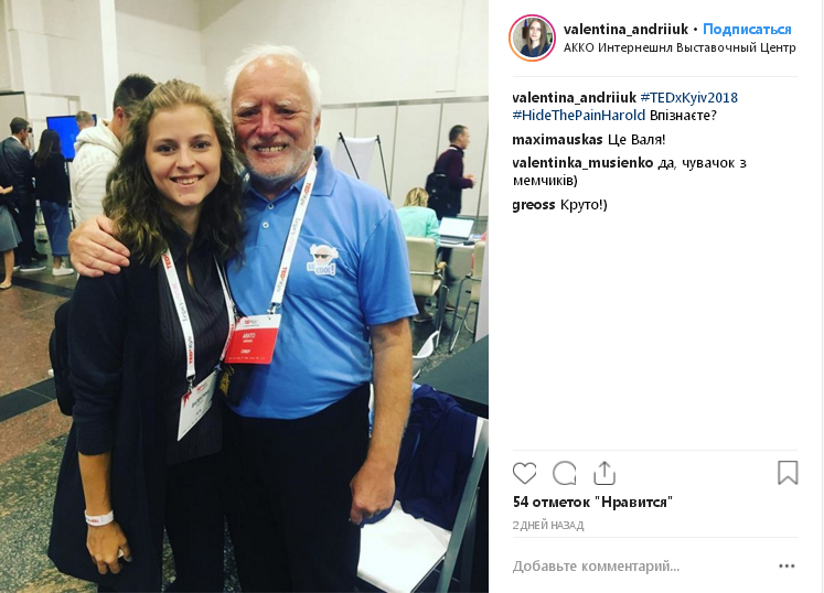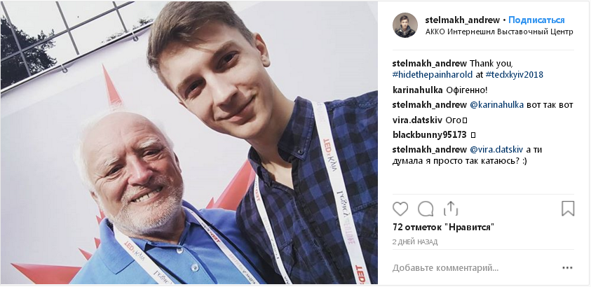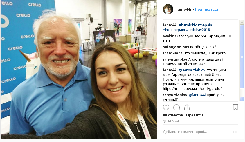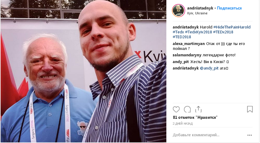 Дед Гарольд, он же «Гарольд, скрывающий боль», впервые приехал с визитом в Киев. Человека-мема заметили 8 сентября на конференции TEDxKyiv и уже начали постить фото с ним в соцсети. Об этом сообщает издание "Информатор".