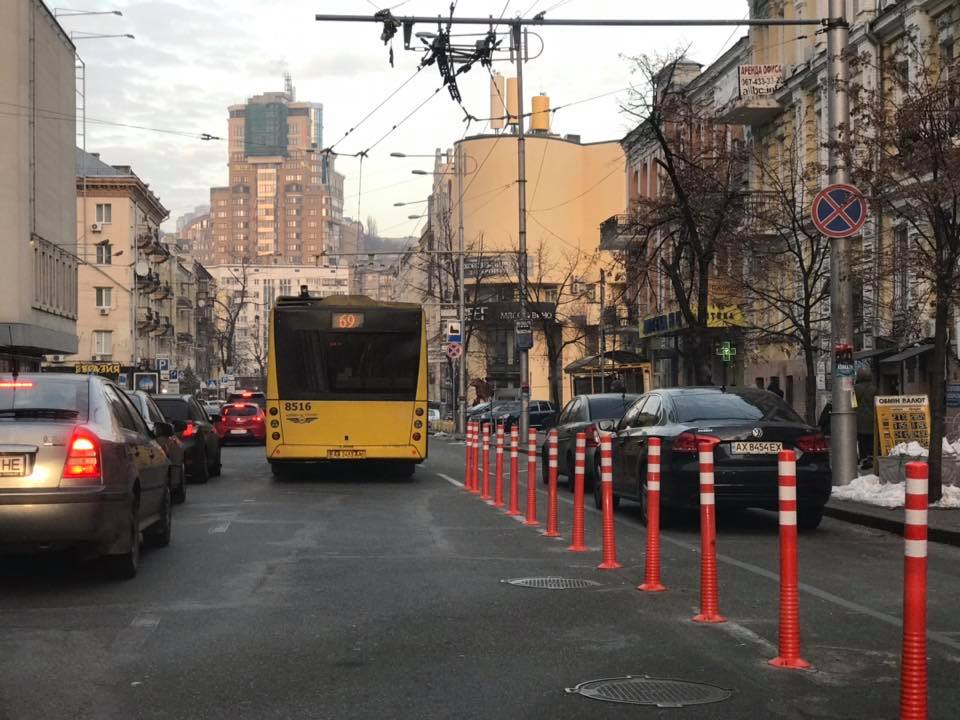 Недавно в Киеве полосу для общественного транспорта по улице Шота Руставели оградили специальными столбиками - делиниаторами, с целью предотвратить нелегальную парковку, которая мешает движению троллейбусов.