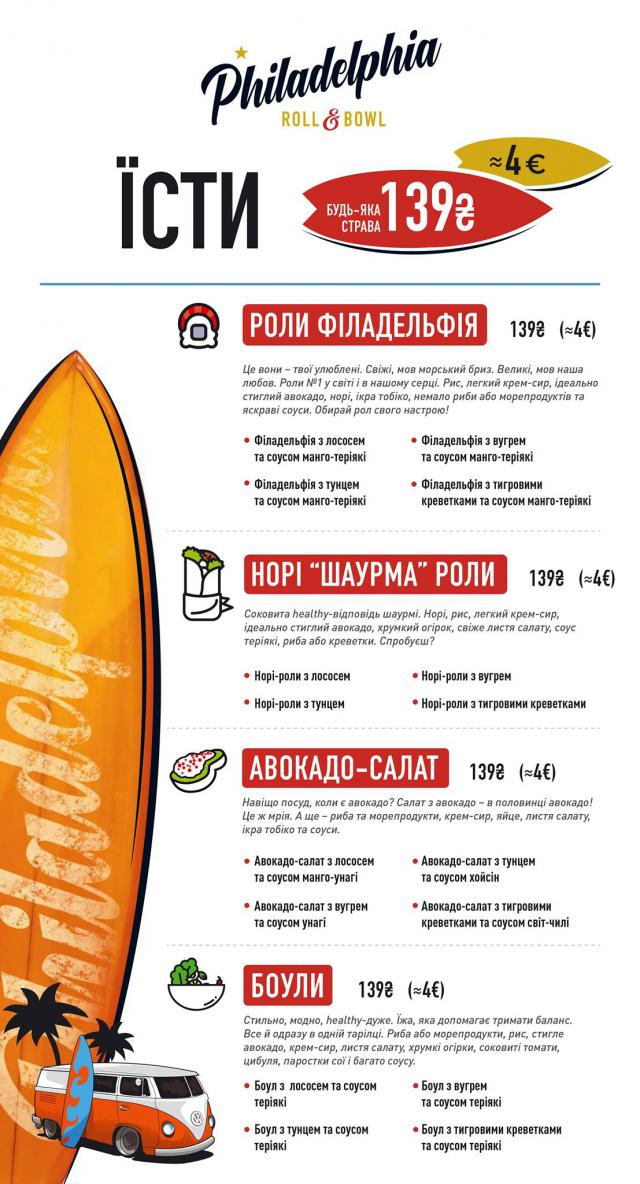 "Philadelphia Roll&Bowl" это еще один новый формат от Семьи ресторанов Дмитрия Борисова. Фишка ресторана - любое блюдо в меню стоит 139 гривен.