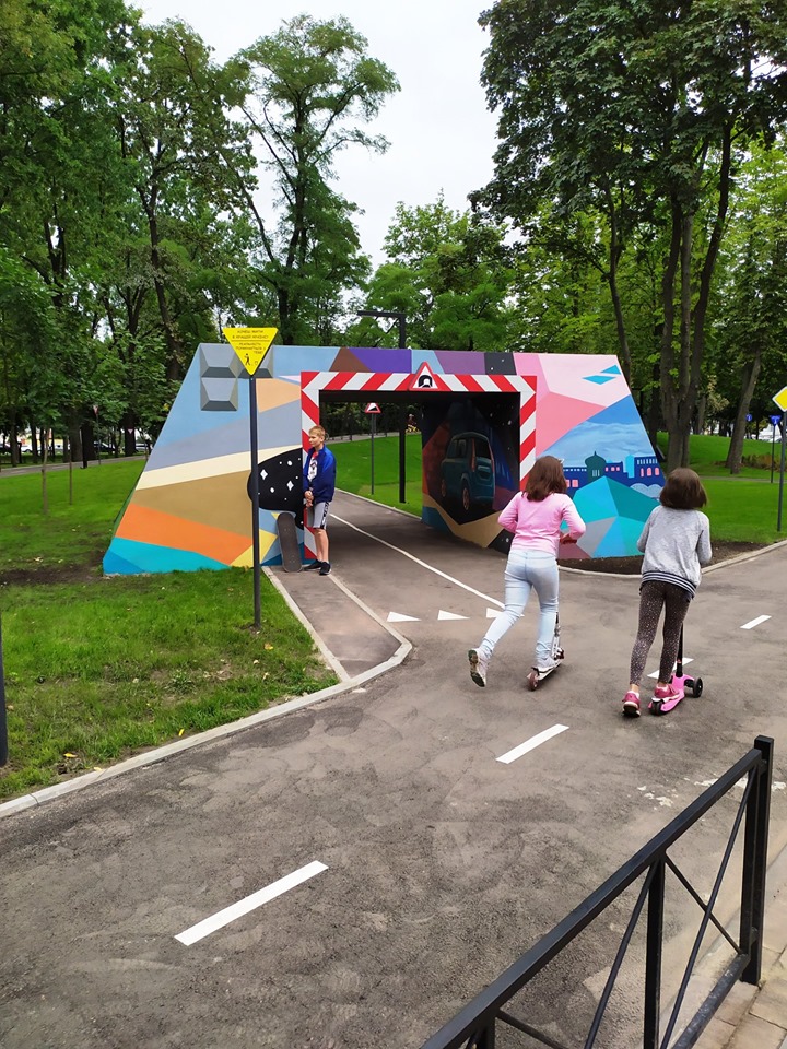 В автогородке обустроили новые дороги с разметкой и знаками, подсвеченные перекрестками, развязками, тоннелем, железнодорожным переездом и остановками для пассажиров.