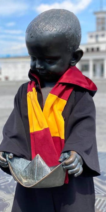 Этот бронзовый монумент возле Днепра регулярно украшают в честь знаменательных событий и праздников. Ранее, в начале июля, "малышей-основателей Киева" приодели к Ивана Купала.