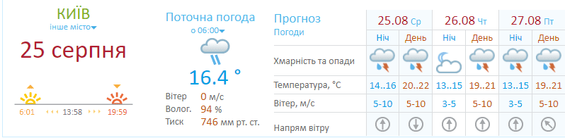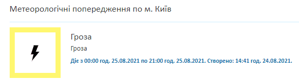 Эта рабочая неделя для гостей и жителей Киева закончится ливнями. На среду, 25 августа, метеорологи объявили первый желтый уровень потенциально опасных погодных условий в связи с грозами. Средняя температура воздуха не должна опуститься ниже 19 градусов тепла. Этому соответствуют данные Укргидрометцентра и Аccuweather.