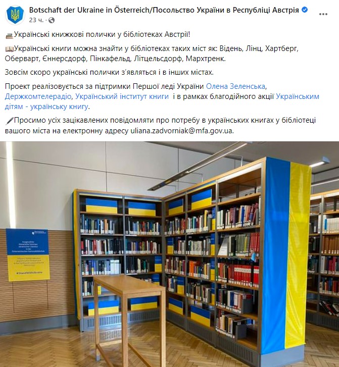 Кроме того, в Посольстве Украины также сообщили, что в библиотеках Австрии появились книжные полки с произведениями на украинском языке. Этот проект реализован при поддержке первой леди Украины Елены Зеленской в Вене, Линце, Хартберге, Оберварте, Еннерсдорфе, Пинкафельде, Литцельсдорфе и Мархтренке.