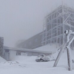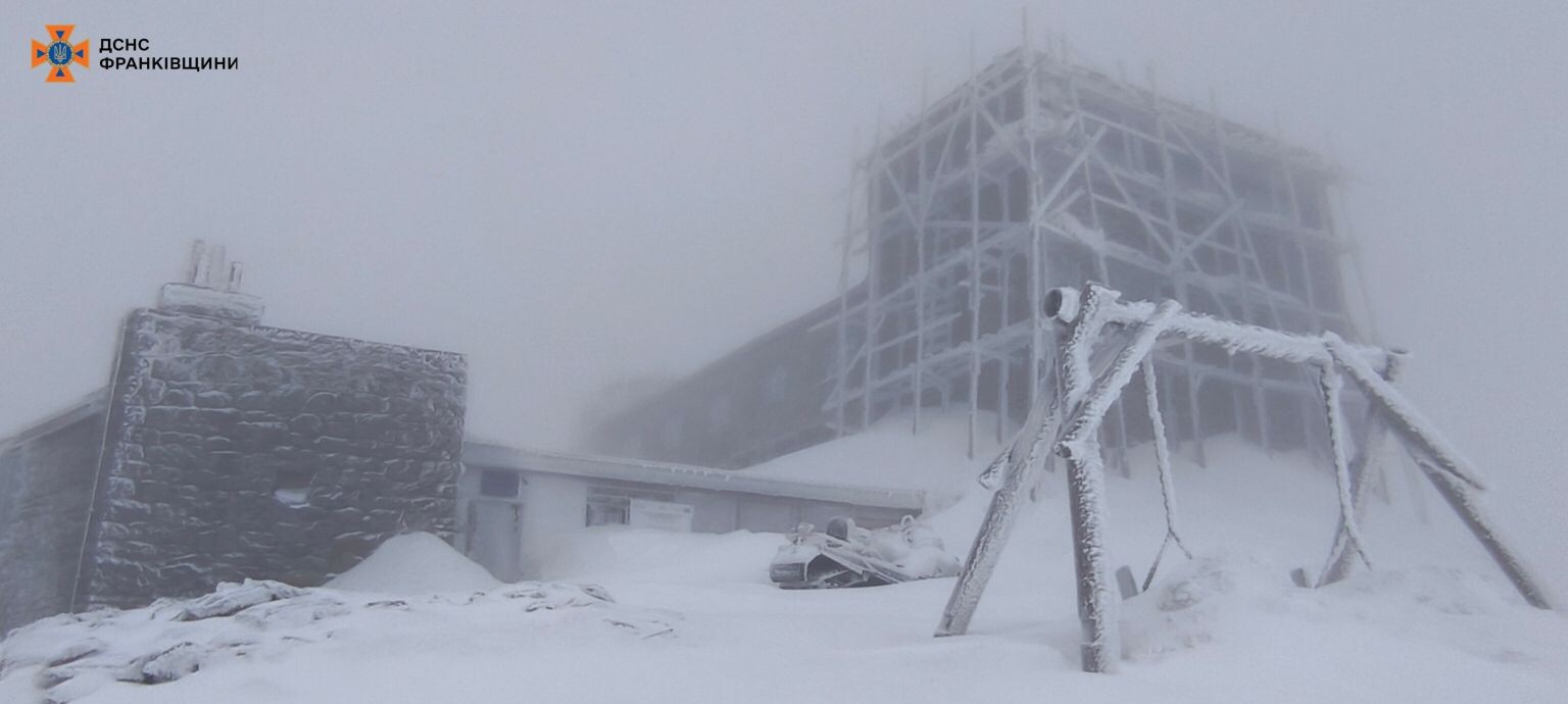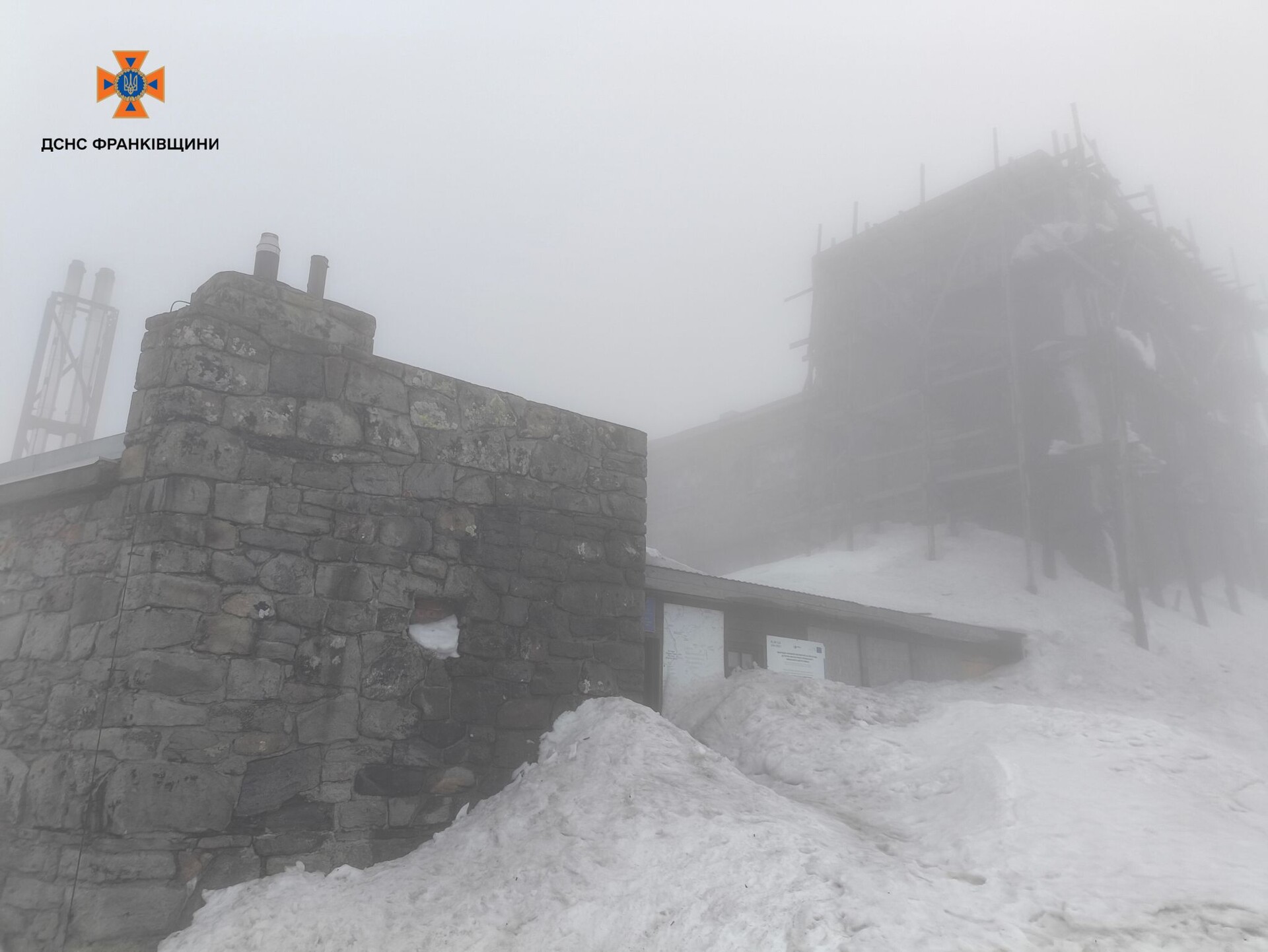 Одну из самых высоких вершин Украинских Карпат (2028,5 м) уже успел покрыть немалый слой снега. Его можно увидеть как на земле, так и на руинах польской астрономо-метеорологической обсерватории.