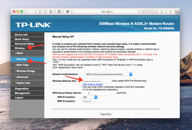 Если у вас есть доступ к веб-интерфейсу, то пароль роутера можно посмотреть там. Для этого надо перейти в браузере по адресу 192.168.0.1 (или 192.168.1.1) и ввести логин и пароль. Структура меню у каждого производителя отличается, но суть в том, чтобы найти раздел Wireless Network, в котором есть пункт Security с опциями защиты. В нём и содержится наш ключ, то есть пароль беспроводной сети.
