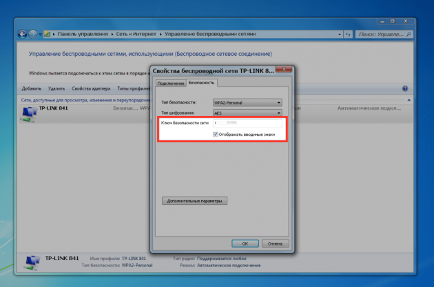 Нужно перейти в «Центр управления сетями и общим доступом» и добраться до списка беспроводных сетей. Затем открыть свойства нужной сети и посмотреть пароль в поле «Ключ безопасности сети», не забыв поставить галочку на «Отображать вводимые знаки».