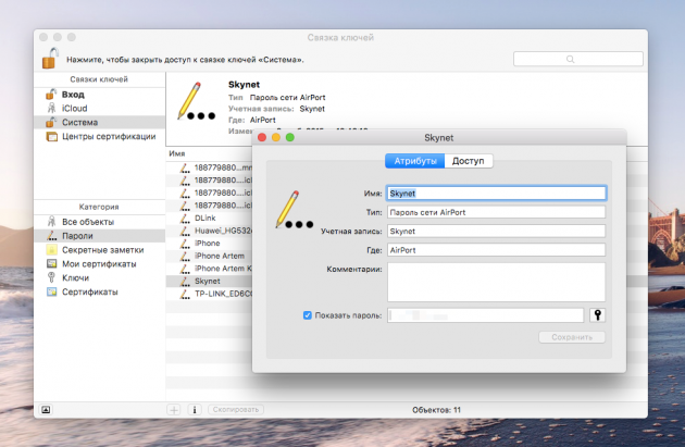 Делается это в «Связке ключей», где хранятся все ваши пароли. Запускаем её через Spotlight или из папки «Программы» и выбираем на боковой панели слева раздел «Система». Далее находим нужную сеть в списке и жмём на кнопочку «i» на панели ниже. Ставим галочку возле «Показать пароль» и после ввода пароля администратора видим наш пароль от Wi-Fi.