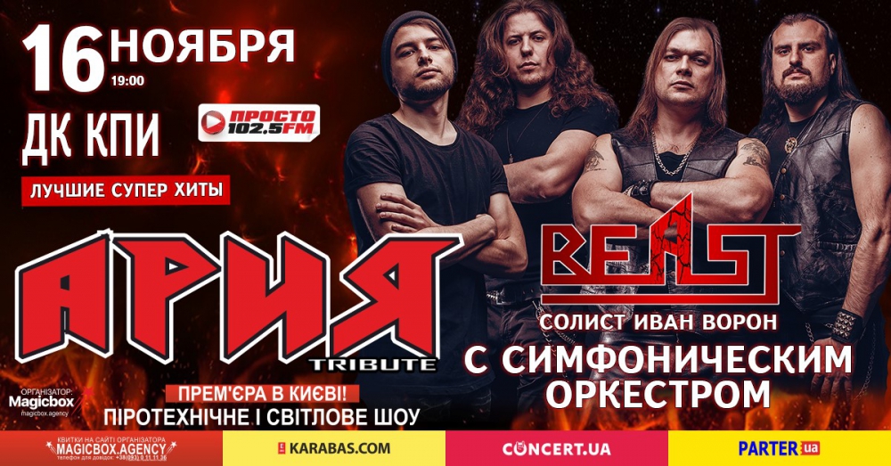 Для всех ценителей тяжелого рока и поклонников творчества "Арии"! Участник проекта "Голос страны" Иван Ворон и tribute группа BEAST технично и эмоционально исполнят все главные хиты легендарной группы. На концерте прозвучат такие песни как "Я свободен", "Потерянный рай", "Возьми моё сердце", "Осколок льда", "Герой Асфальта", "Ангельская Пыль" и многие другие.