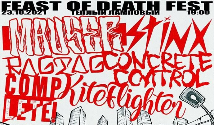 В этот вечер на Feast of Death fest будет звучать тяжелая музыка для истинных ценителей жанра. Слушатели окунутся в атмосферу хардкорного панка и скейт-панка, стрит-панка рок-н-ролл, быстрого мелодичного панк-рока и не только.