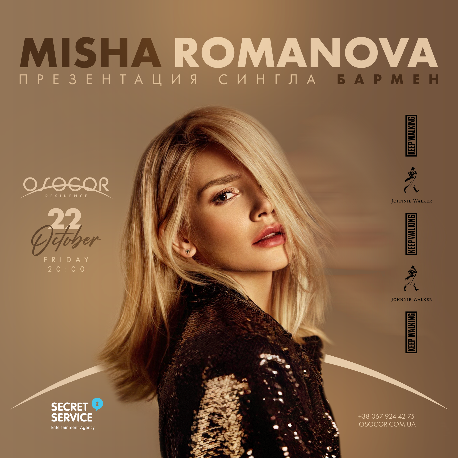 22 октября Миша Романова с сольным концертом и презентацией такого долгожданного сингла «Бармен». Вас ждет атмосферный перфоманс с концептуальной хореографией и любимыми композициями. Камерная обстановка ресторана, знакомые песни и счастливые люди вокруг - Эмоции. Музыка. Миша.