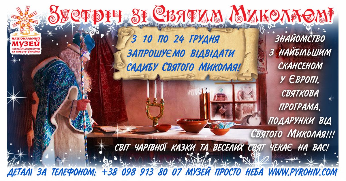 Музей народной архитектуры и быта Украины приглашает посетить зимнюю резиденцию и встретиться со Святым Николаем. В программу входит прогулка с личным гидом, праздничные украинские традиции, давние обряды и новогодние песни. За дополнительную плату есть возможность попасть на мастер-класс или получить подарок. По вопросам предварительной записи звоните по номеру 098 913 80 07.