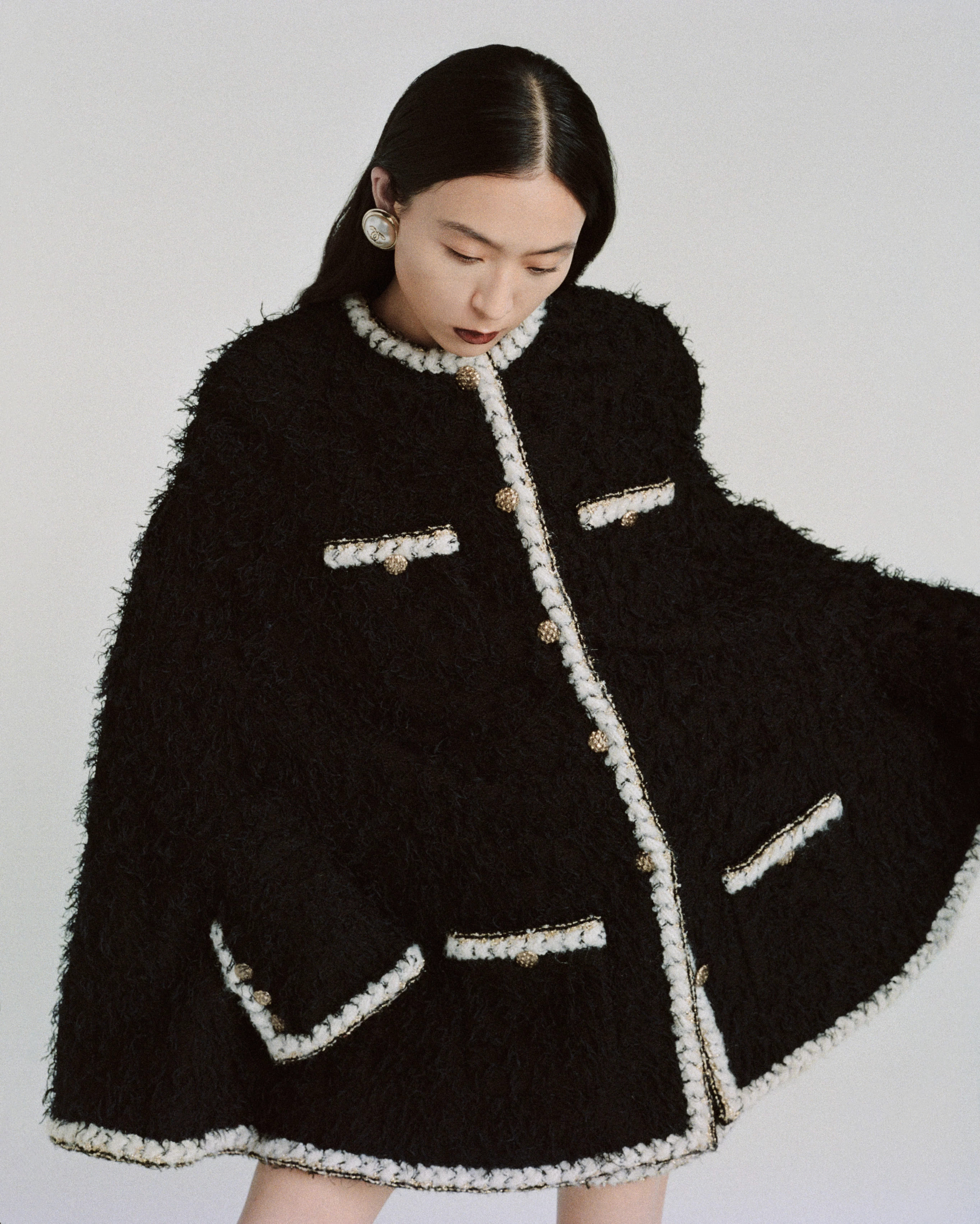 Классическое сочетание черного и белого обожала еще Коко Шанель — контрастная светлая окантовка мгновенно делает мягкое полупальто более структурированным и задает динамику всему образу.