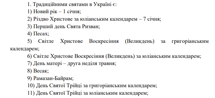 Документом предусмотрено определить всего 20 праздников в Украине, как традиционные. Этот перечень будет содержать праздничные даты пяти вероисповеданий и светские праздники, которые являются устоявшимися и отмечаются веками, или же эти праздники ввели в систему по закону.