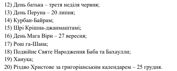 Так, в Украине хотят ежегодно праздновать День бога Перуна 20 июля и Кришны, День отца, День рождения Бахауллы, Рош а-Шана, Хануку, Курбан-байрам и другие. Добавим, что проект был вынесен на общественное обсуждение, и еще не принят окончательно.