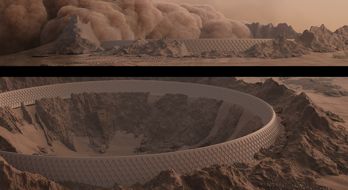 Эту концепцию назвали Plan C. По сути, предполагается, что поселение будет автономным, а внешние стены этого "города" сделает 3D-принтер, потому что строительство людьми будет невозможно из-за недостатка кислорода на поверхности планеты. Сама конструкция в виде огромного "бублика" и свободно перемещаться можно только внутри помещений.