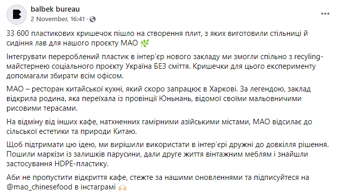 Киевское архитектурно-дизайнерское бюро Balbek Bureau во время работы над проектом харьковского ресторана китайской кухни "МАО" подошли эко-сознательно к созданию частичного интерьера.