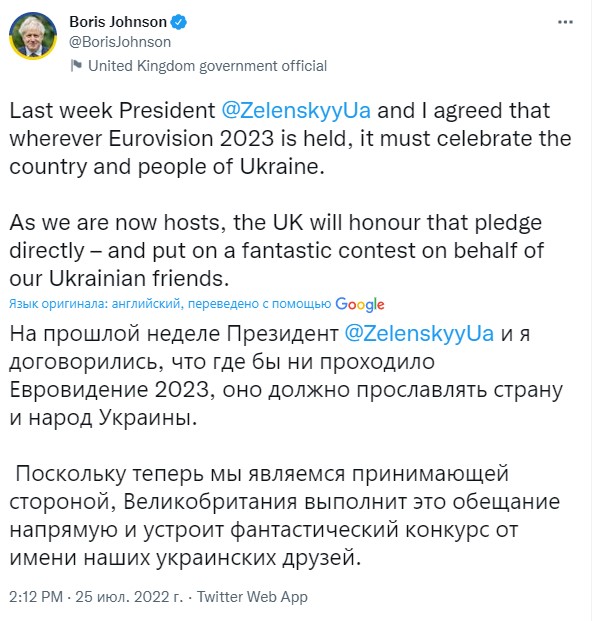 25 июля стало известно официальное и окончательное решение, что международный песенный конкурс "Евровидение" в 2023 году пройдет не в стране-победительнице прошлого конкурса, в Украине, а в Великобритании. В то же время премьер-министр Великобритании Борис Джонсон прокомментировал такое заявление организаторов шоу у себя в социальных сетях.