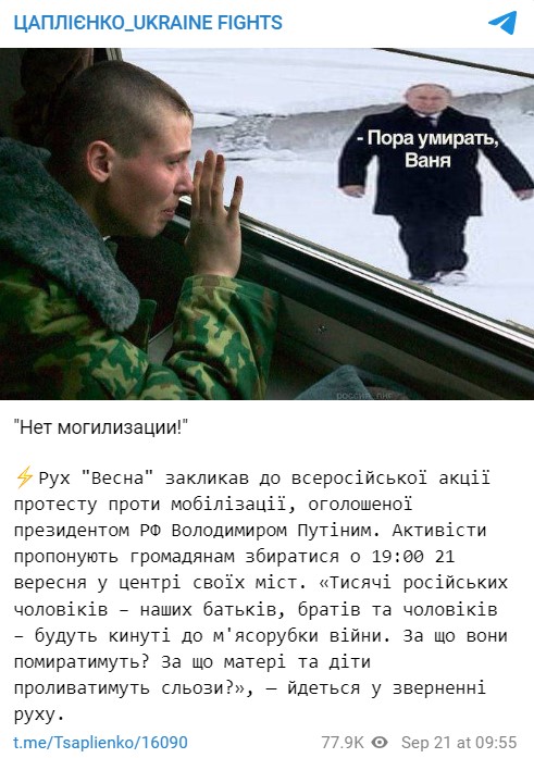 По некоторым данным, активисты из РФ агитируют выходить россиян вечером 21 сентября в центр своих городов, чтобы выступить против мобилизации.