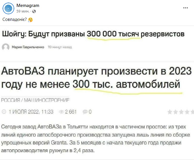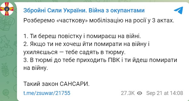 Спустя некоторое время по российскому телевидение начали показывать министра обороны РФ Сергей Шойгу, где тот называет план о призыве на фронт в Украину якобы 300 тысяч резервистов - 1% от общего мобилизационного ресурса. Шойгу к тому же решил добавить, что в российской армии погибли 5 937 военных, хотя официальная украинская статистика потерь говорит о более чем 55 тысяч погибших солдат РФ за все время войны после полномасштабного вооруженного вторжения России в Украину.