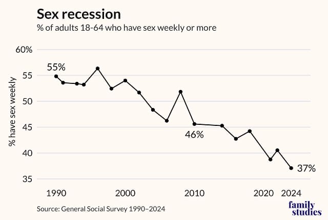 Как отмечает Institute for Family Studies (IFS), в 1990 году 55% опрошенных в возрасте 18–64 лет сообщали, что занимались сексом хотя бы раз в неделю. В 2024 году доля таких ответов сократилась до 37%.