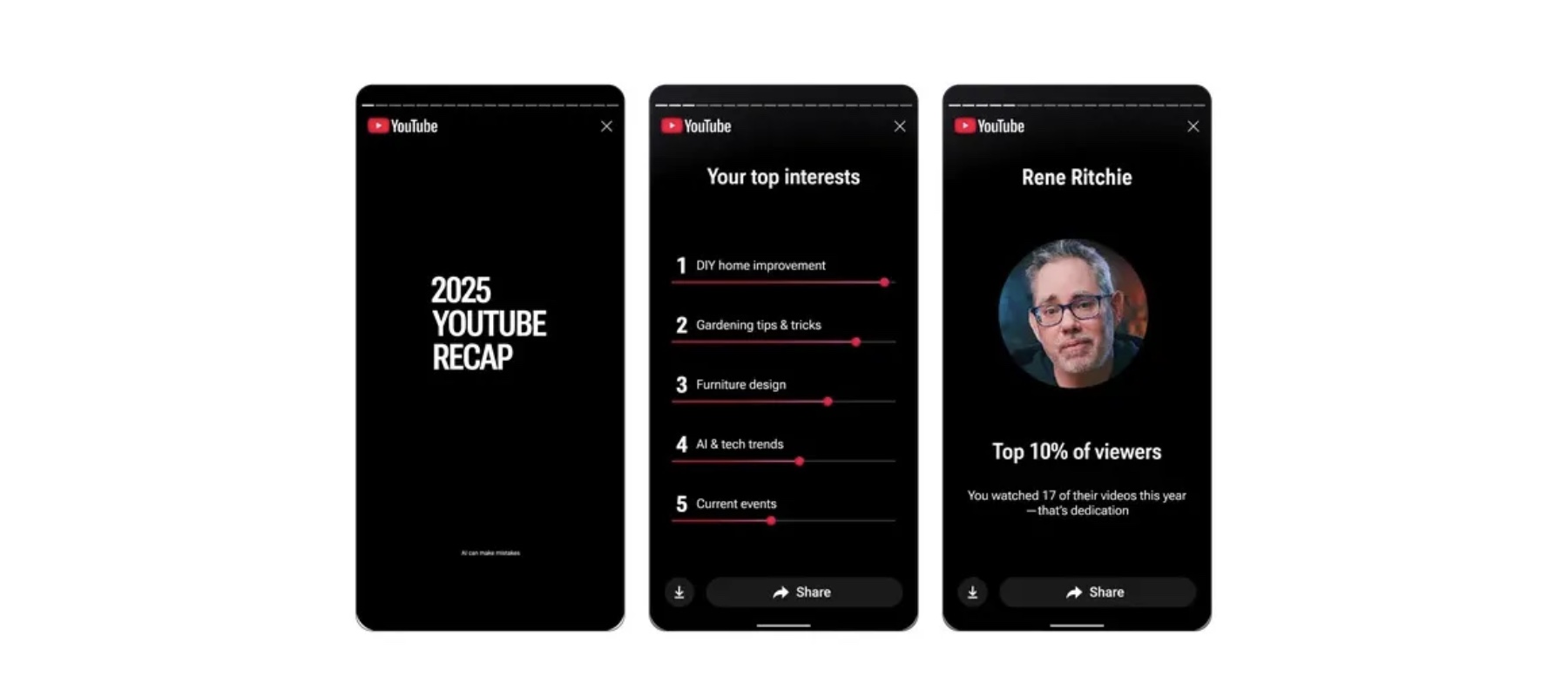 YouTube представил Recap — персональные итоги года, в которых собраны самые интересные привычки пользователя в плане просмотра видео. Также в конце года платформа традиционно объявила имена, темы и треки, которые больше всего формировали контент в 2025-м.