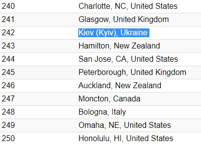 Кроме того, Киев попал в топ-250 первых безопасных мест, расположившись на 242-м месте с индексом 54,55 между шотландским портовым городом Глазго и городом Гамильтон на Северном острове Новой Зеландии. В рейтинге также оказались такие украинские города: Львов (188 место), Харьков (283 место), Днепр (305 место) и Одесса (334 место).