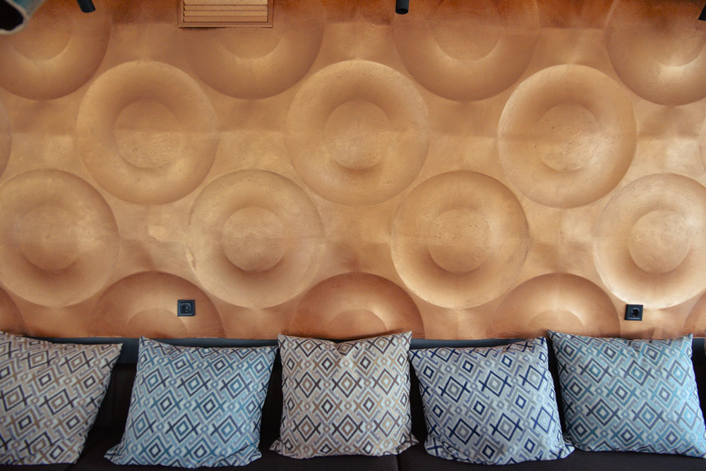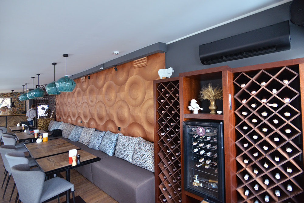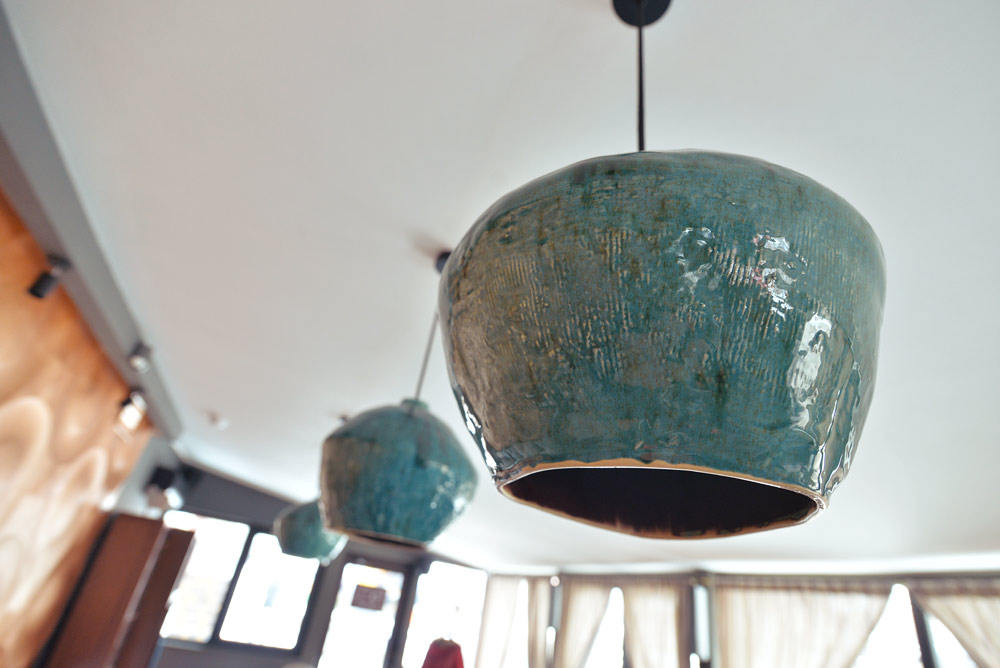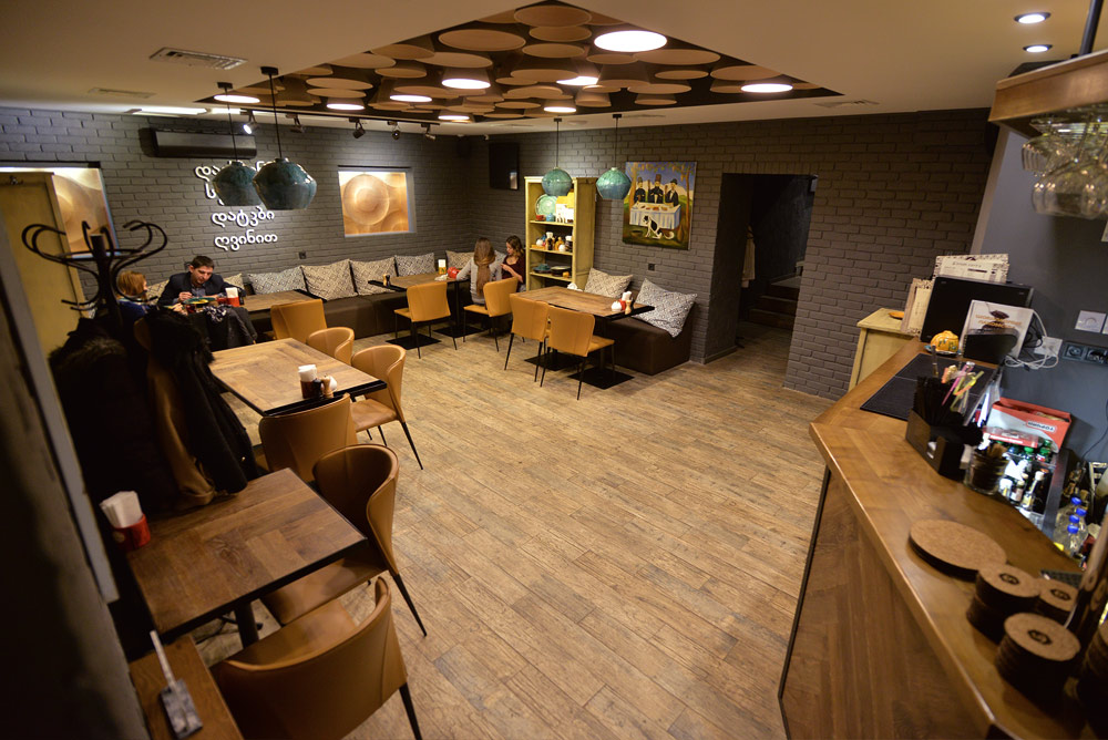 Теплый свет добавляют глиняные светильники. На стене вдохновляющая надпись на грузинском «Наслаждайся жизнью и пей вино!» и несколько картин. Интересно, что одна из них рассказывает о грузинском застолье с пивом. По словам Анны Герман, в Украине существует стереотип, что грузины большие поклонники вина, когда на самом деле, они также любят и пиво!