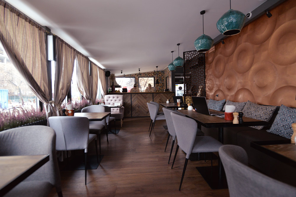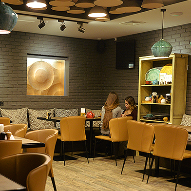 Яркая посуда ручной работы на столах и полках, а также стулья горчичного цвета создают невероятно уютную атмосферу. На диванах подушки и накидки из натуральных тканей, стулья ортопедические, оббитые натуральной кожей. Абсолютно всю мебель для заведения делали под заказ.