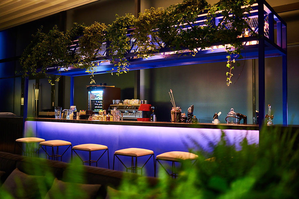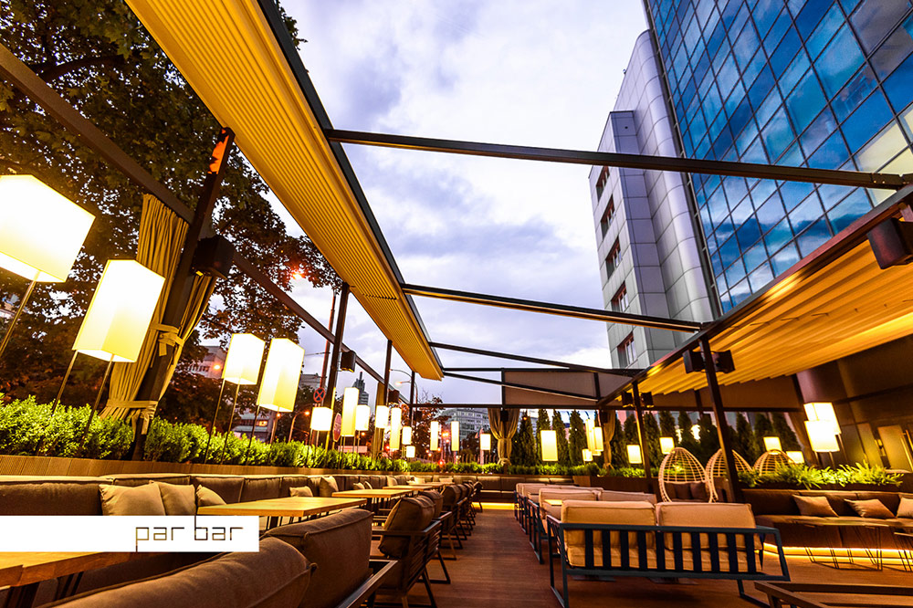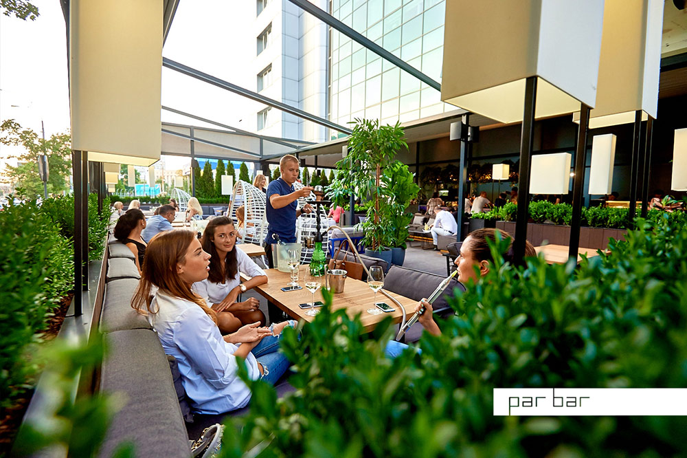 Просторная летняя терраса Par Bar² впечатляет своими размерами – на ней может разместиться до 80 человек. Стиль лофт, в котором выполнена терраса, поддерживается тремя цветовыми решениями: серо-коричневым (стены, пол, часть мебели, столы), ультрамариновым (барная стойка, отдельные диваны) и зеленым (многочисленные растения по периметру террасы и внутри неё). Крыша над террасой раздвижная, когда небо чистое и безоблачное, её открывают, чтобы насладиться звездами.