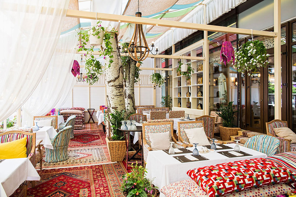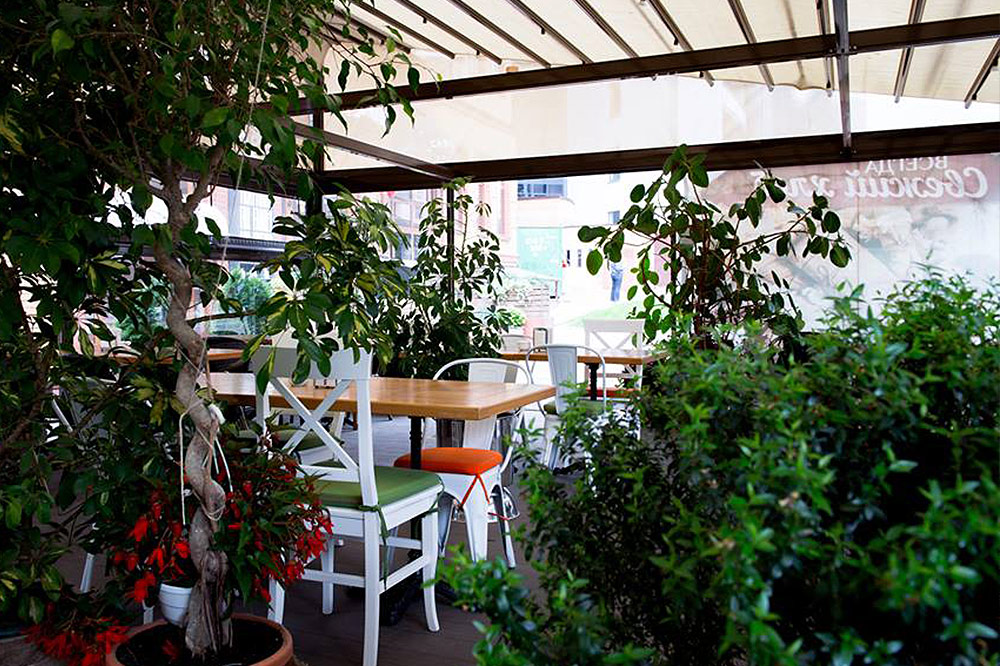 Просторная и уютная летняя площадка удачно расположилась в глубине улиц, она скрыта от посторонних глаз, и потому на ней можно по-настоящему уединиться. Удивительно, как здесь сочетается кипящая энергия города и расслабленность летнего отдыха. Вечерами в ресторане играет джаз и лаунж, выступают вокалисты.