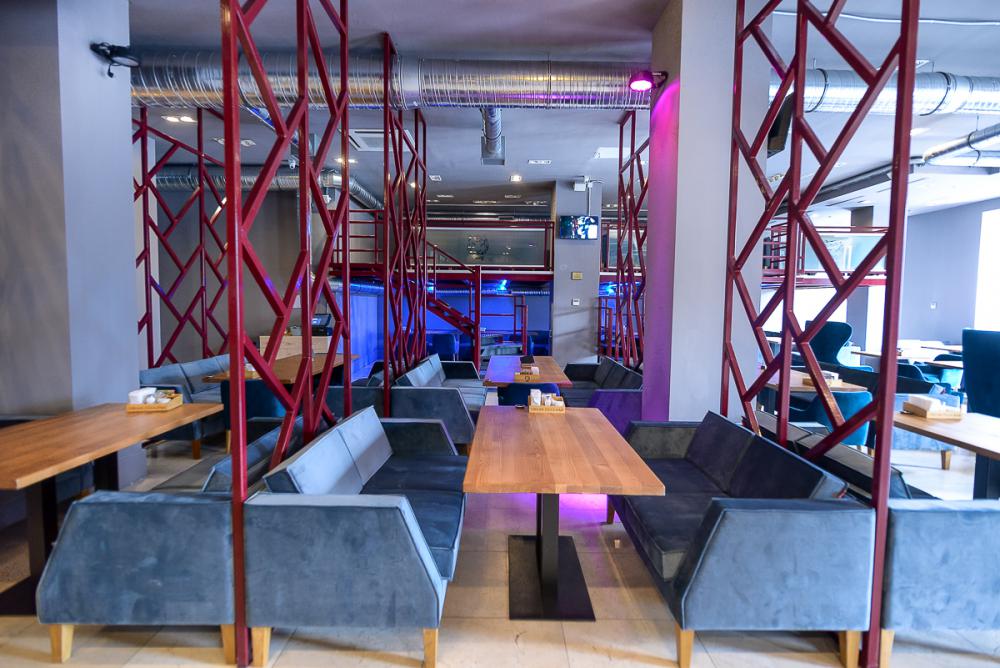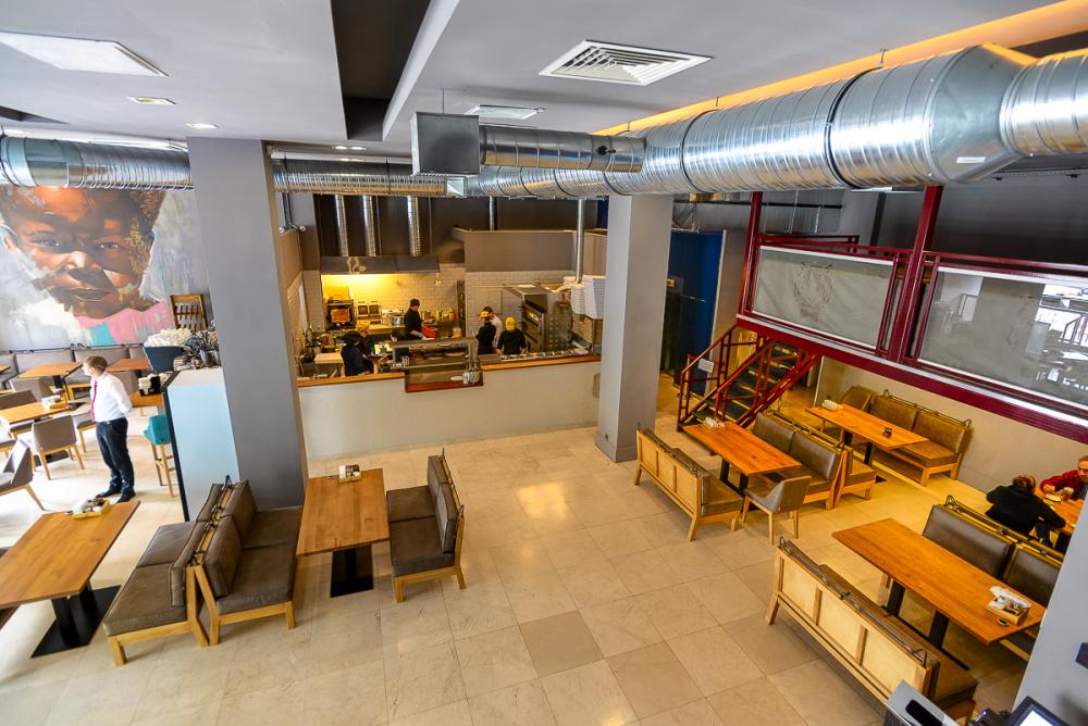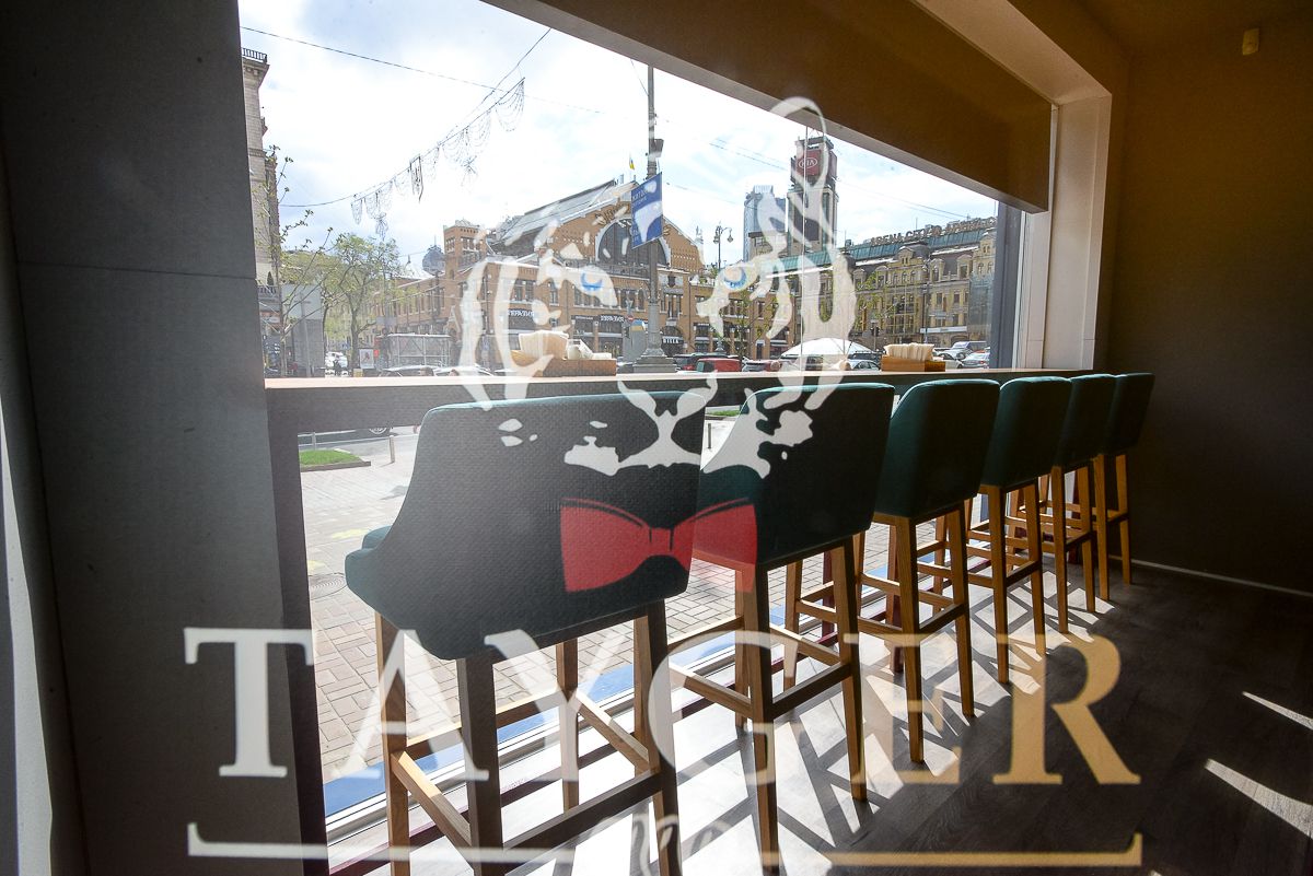 Заведение занимает три этажа и имеет три зала на 500 посадочных мест, в каждом из которых царит своя атмосфера. На первом этаже обустроена дневная зона отдыха. При входе есть столы у панорамных окон, где гости любят завтракать и обедать с видом на Крещатик. Здесь много солнечного света, а светлые стены создают легкую непринужденную атмосферу – то, что нужно для завтрака или ланча. Здесь же обустроен кофе-поинт и небольшие столики, за которыми можно выпить чашечку ароматного.