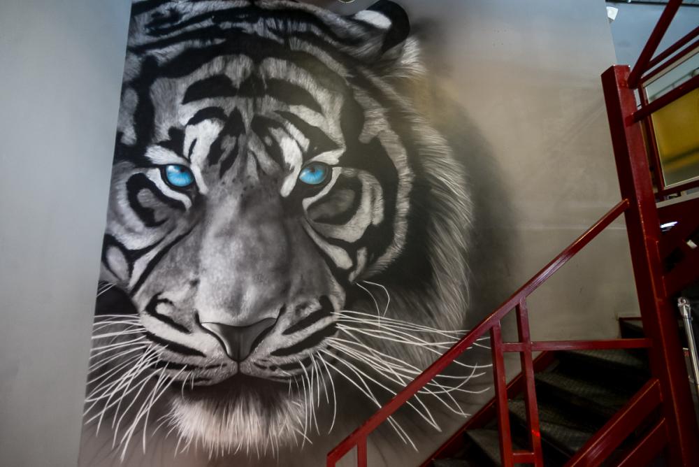 Особое настроение в Tayger Pizza Bar делают детали, которые также служат и фотозонами для гостей. Стены здесь украшены броскими рисунками, которые на фоне пастельных тонов интерьера служат яркими акцентами. В будущем в ресторане планируют добавить еще несколько интересных предметов интерьера вдоль лестницы.