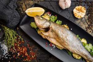 Сибас в ресторане подается цельным, а поставляется на кухню прямиком из вод океана. Рыбная витрина открыта перед гостями, что позволяет самостоятельно выбрать рыбу для приготовления в ресторане. Свежий улов приезжает в ресторан "Рыба в огне" каждых 3 дня.