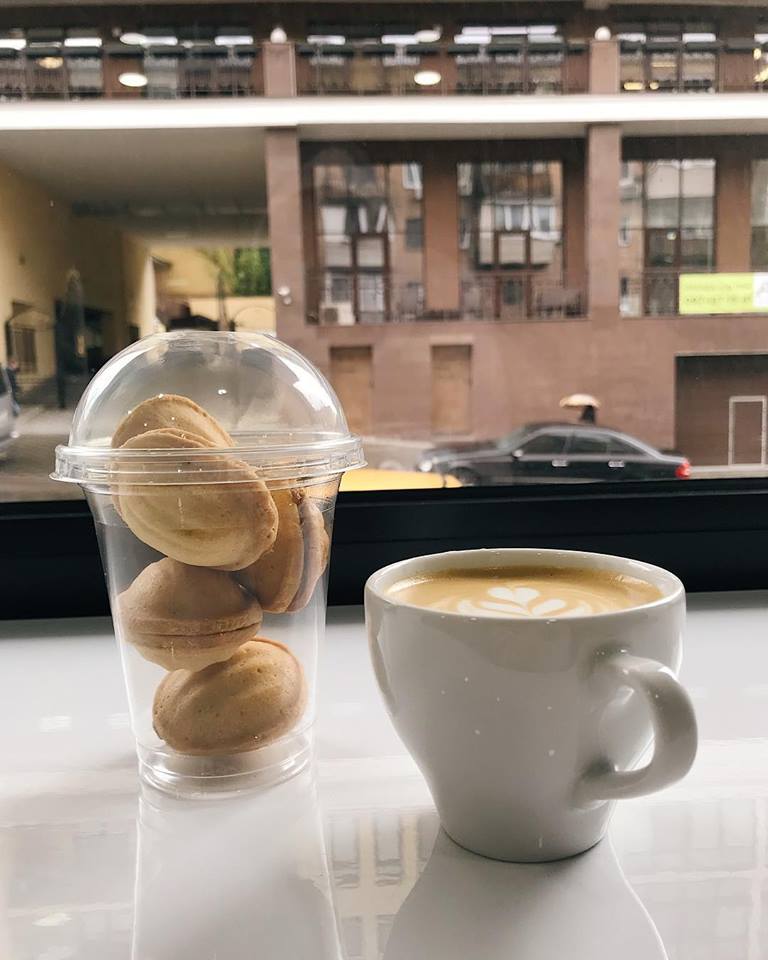 Основа в меню - кофейные напитки и десерты, например, орешки из детства, американское печенье двух видов (клюква + орех и шоколад + орех), чизкейк.