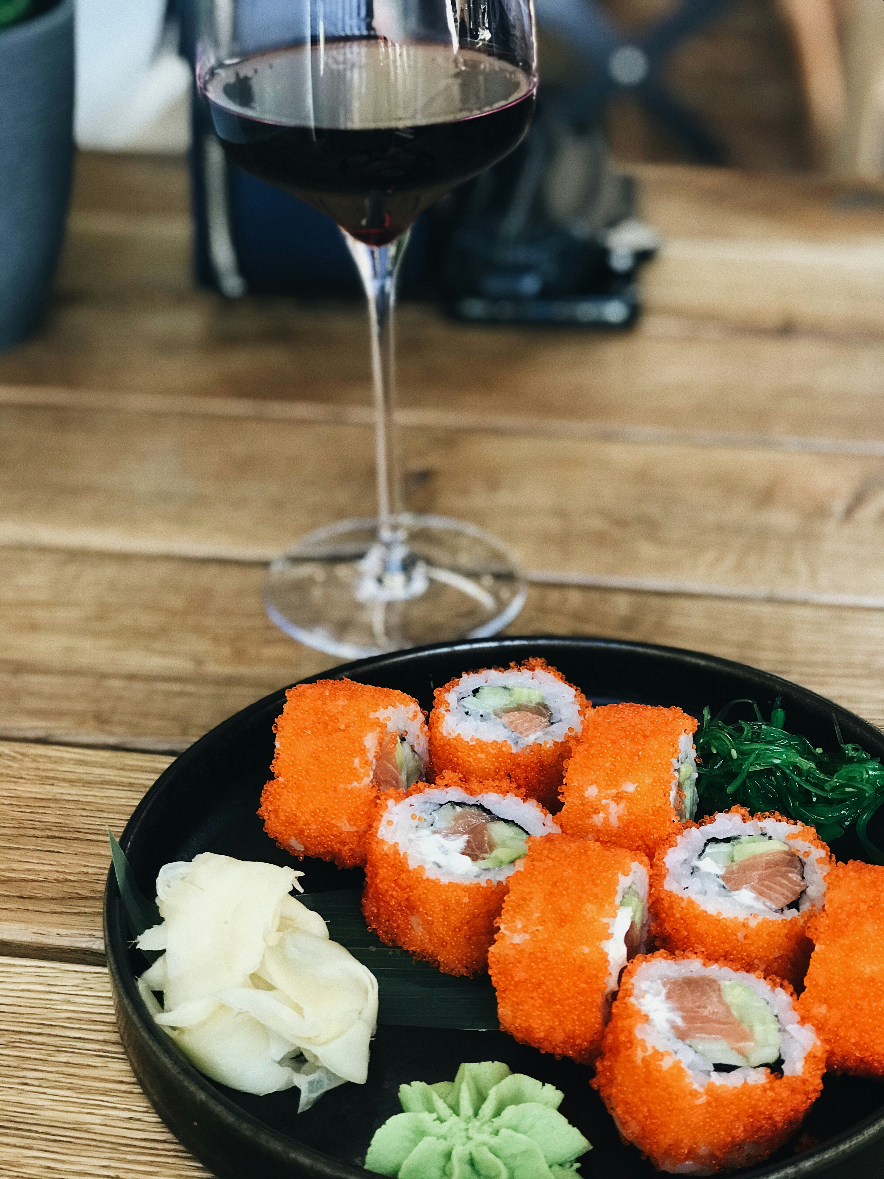 Суши с кремовыми соусами и вино с богатыми ароматами