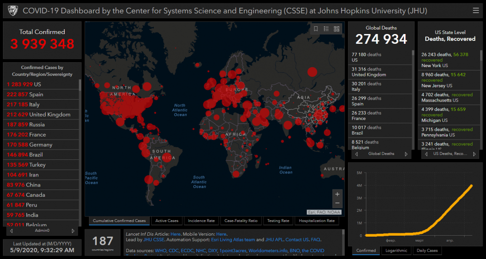 В мире зафиксировано 3 939 348 человек с COVID-19. За сутки цифра увеличилась на 92 246. Большая часть заболевших находится в США. Россия поднялась на две строчки в рейтинге и заняла пятое место, обогнав Францию и Германию.
