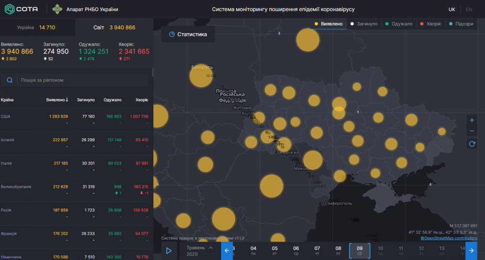 Согласно данным Университета Джона Хопкинса, по состоянию на утро 9 мая Украина находится на 35 месте из 187 стран в рейтинге по количеству подтвержденных случаев.