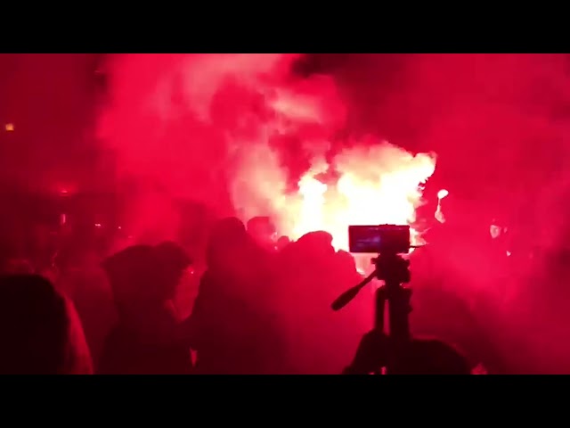 Также демонстранты зажгли файеры и забросали ими здание Офиса президента, разбив несколько окон и стекла входной двери. Вся площадь была в дыму, взрывались петарды. На втором этаже из-за файера загорелось окно.