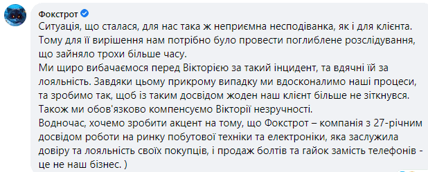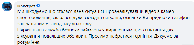 Представители "Фокстрот" прокомментировали, что сожалеют о такой неприятной и неожиданной ситуации. По их словам, iPhone был запечатан в заводскую упаковку. Хотя Виктория на это ответила, что открылась коробка без каких-либо усилий.
