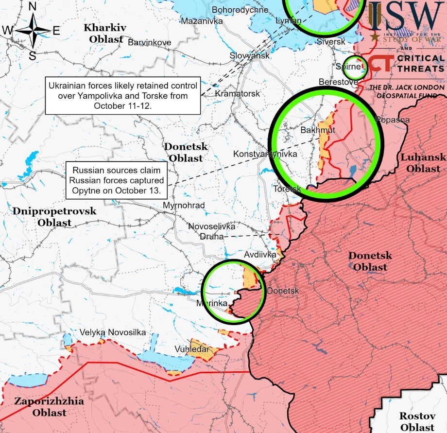 - 16 октября украинские военные представители заявили, что российские войска ложно утверждают, что за последние несколько дней захватили несколько городов недалеко от Бахмута, но украинские силы удерживают свои позиции от российских атак.