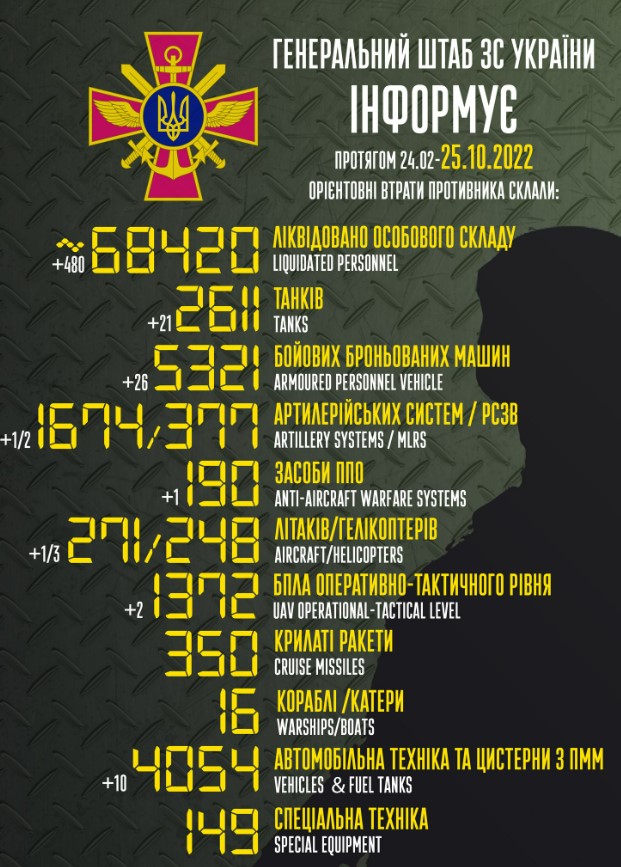 Во вторник, 25 октября, начались 244-е сутки борьбы украинского народа против российской агрессии на территории Украины после полномасштабного вооруженного вторжения России в Украину 24 февраля 2022 года.