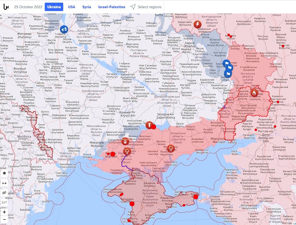 - Украинские силы продолжали наносить удары по скоплениям российских войск у линии фронта в Запорожской области 23–24 октября, а 22 октября нанесли удар по скоплению российских войск и техники в районе Энергодара.