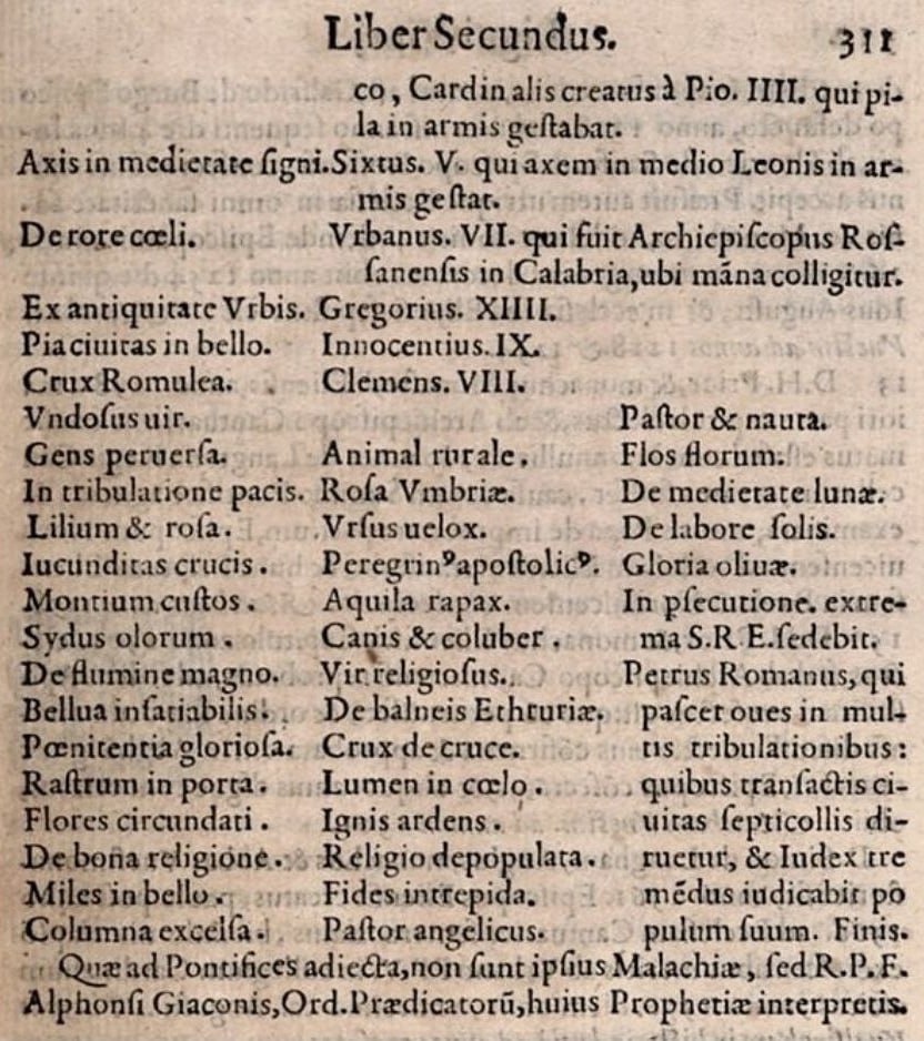 Книга, известная как "Prophetia Sancti Malachiae Archiepiscopi, de Summis Pontificibus", была найдена бенедиктинским монахом Арнольдом Вином в 1590 году в архивах Ватикана. Она содержит 112 латинских изречений, которые, как считается, соответствуют каждому Папе, начиная с Целестина II.